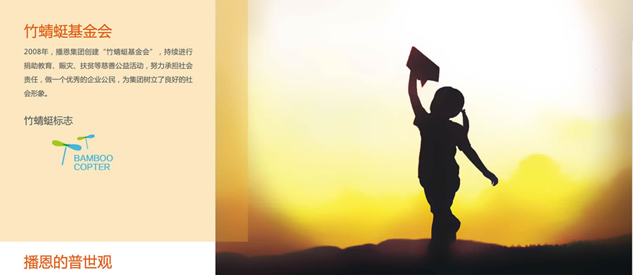 播恩于2008年創(chuàng)建“竹蜻蜓慈善”。持續(xù)進行捐助教育、賑災、扶貧等慈善公益活動,努力承擔社會責任,做一個優(yōu)秀的企業(yè)公民,為播恩樹立了良好的社會形象。