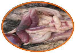 1.3.6 若多種球蟲混合感染,則腸管粗大,腸粘膜上有大量的出血點(diǎn),腸管中有大量的帶有脫落的腸上皮細(xì)胞的紫黑色血液。