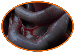 2.3.2 腸道:剖檢可見小腸粘膜肥厚,充血,可見蟲體吸附于小腸粘膜上。寄生部位呈針尖大結(jié)節(jié)樣病變,中央凹陷。大量蟲體聚集時,引起腸堵塞,可造成腸破裂和腹膜炎。嚴(yán)重時導(dǎo)致死亡。見圖4。